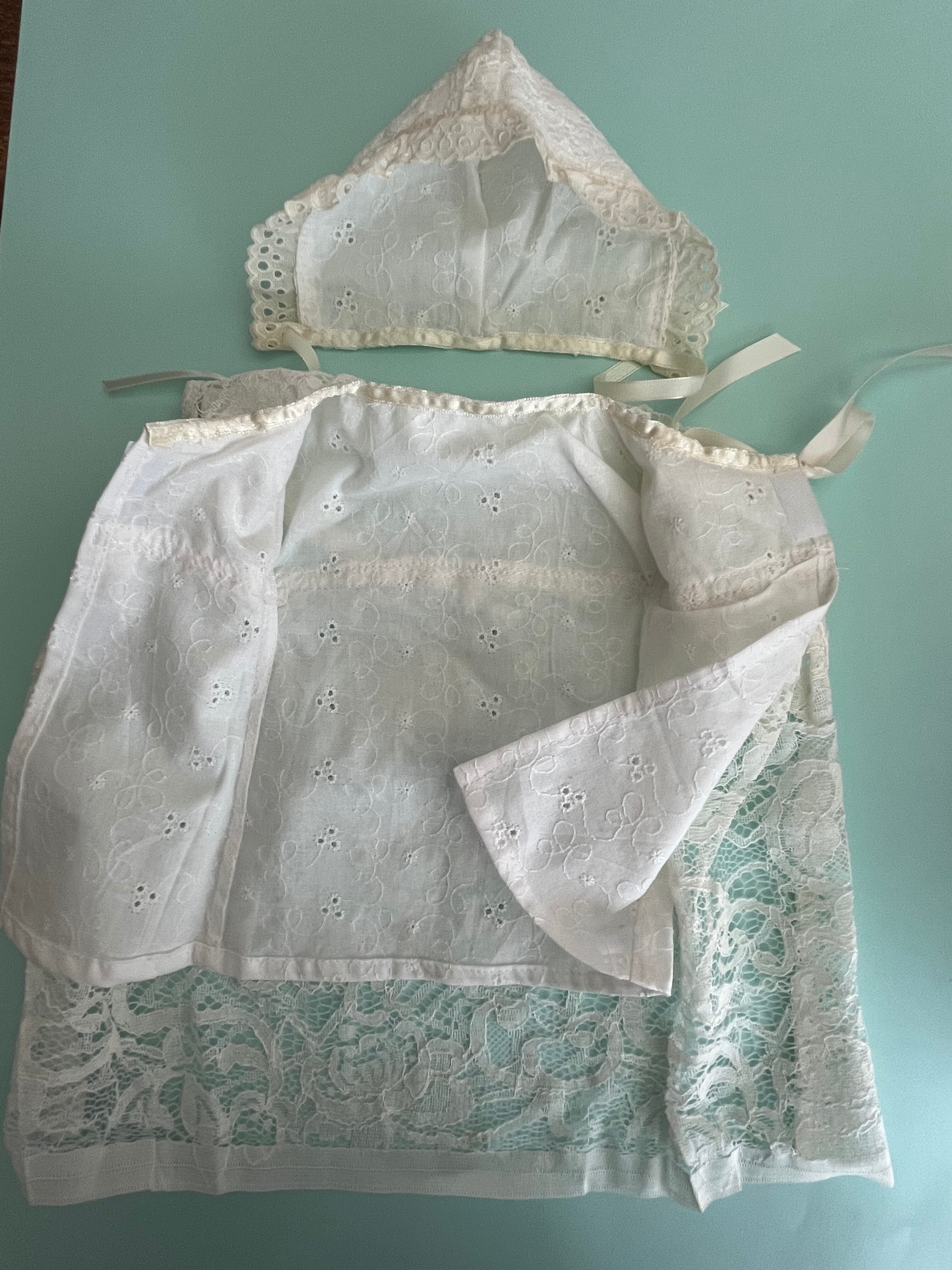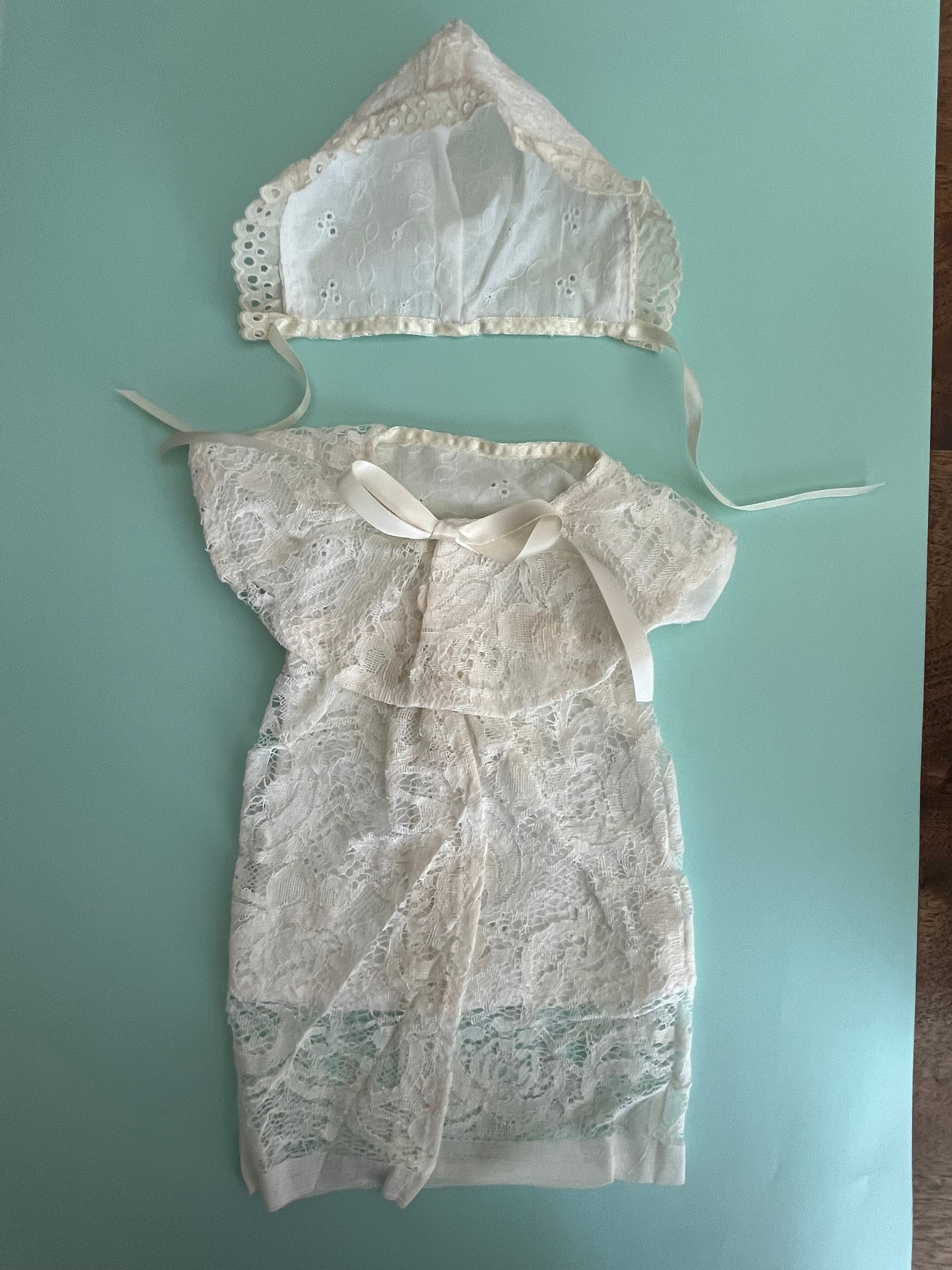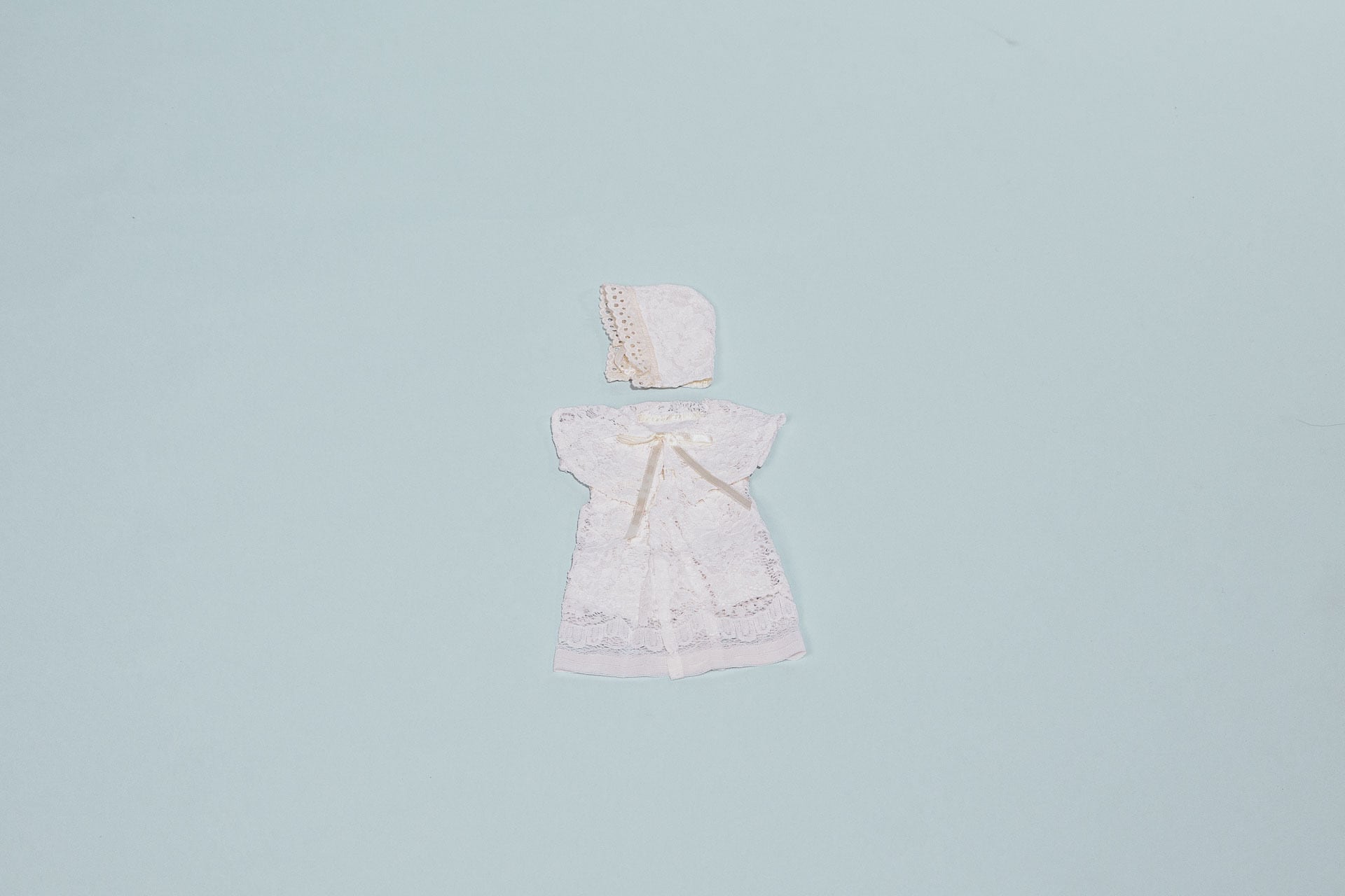 柔らかいレース生地で作られており、生成りの優しい色合いが特徴のセレモニードレスです。